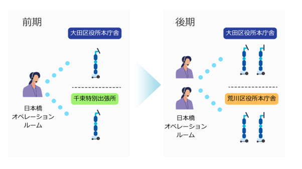 実証期間中、オペレーターは日本橋のオペレーションルームから各拠点へ遠隔接続。前期は1名で計2台、後期は2名で計4台のnewmeを状況に応じて切り替え、効率的な運用を実現しています。