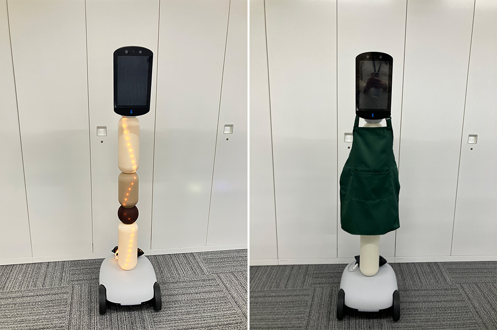 2つ目は、「Robot Friendly Café」のコンセプトに合わせて、newmeに特製のエプロンを着用させて配置しました。機械的な印象を和らげ、まるでカフェのスタッフのように親しみやすい存在として場に溶け込み、“ロボットと共に過ごす未来のカフェ”という世界観を表現しました。